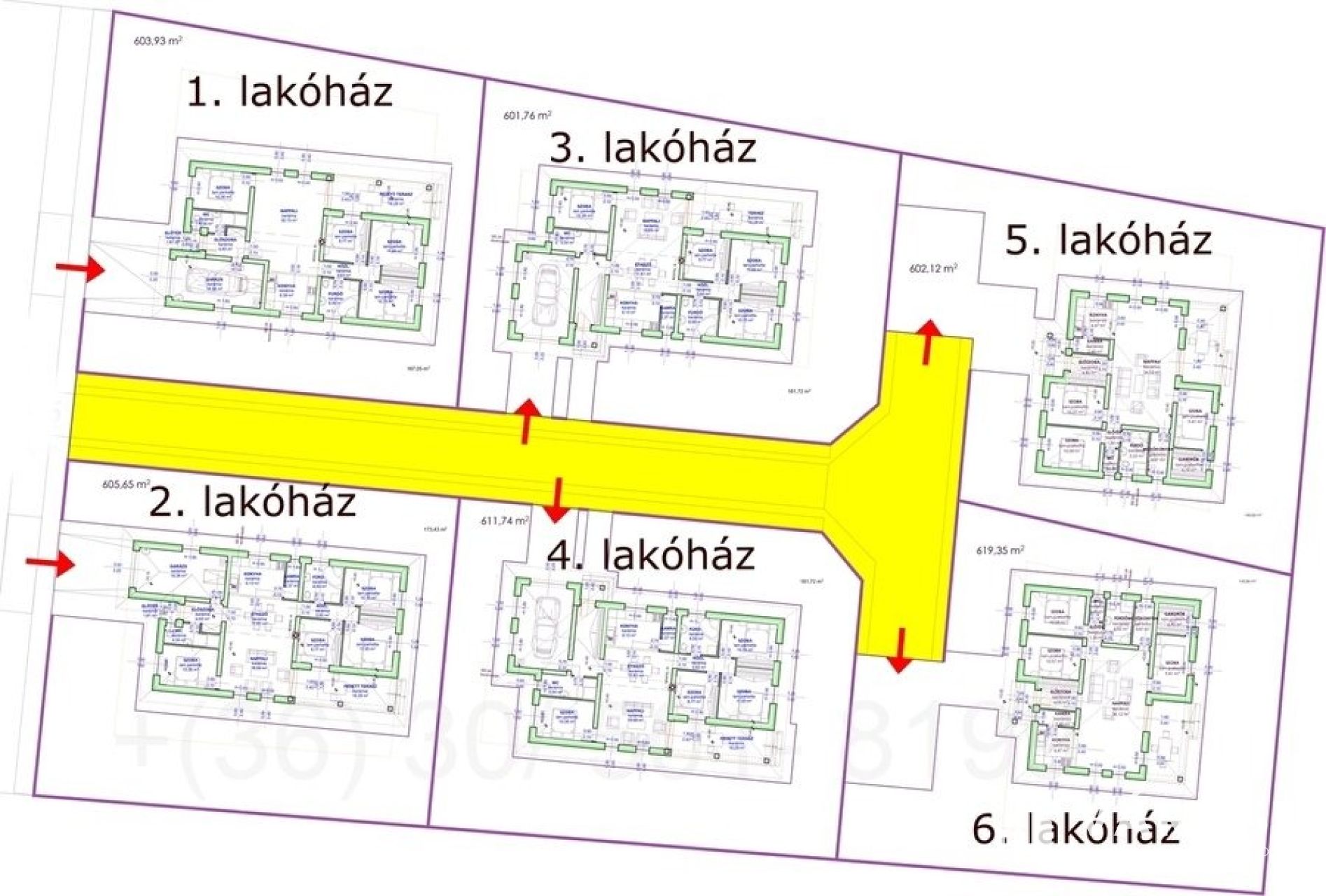 A a 601 m²-es telken. épülő házak már leköthetőek, a nappali + 3 szobás garázs nélküli kivitelben.