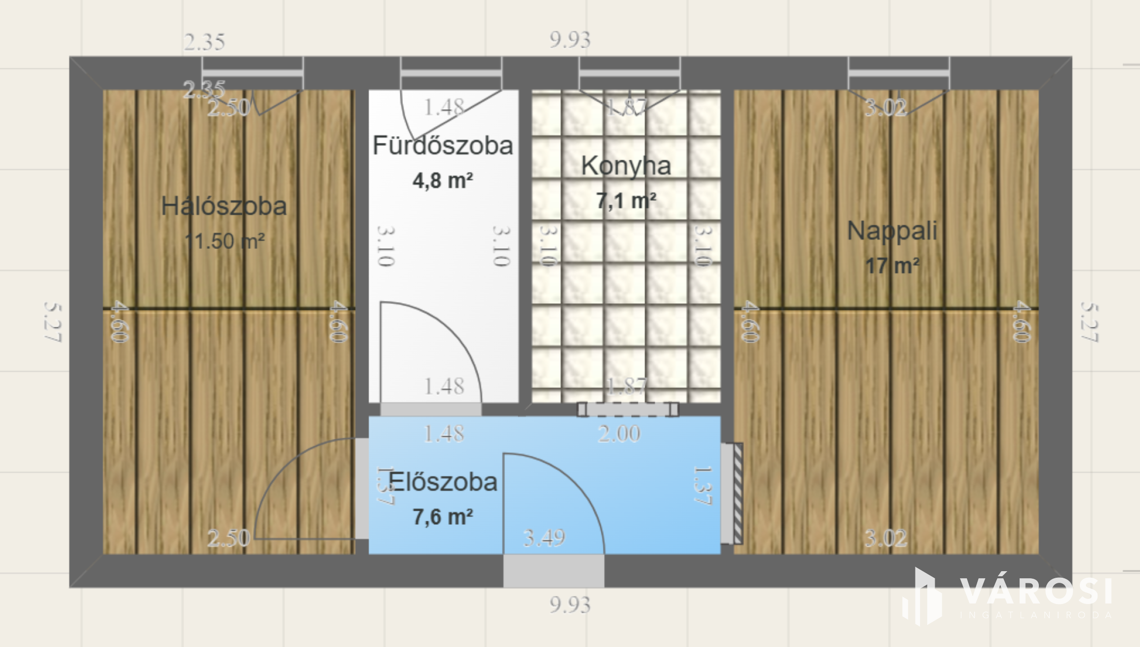 A lakás elosztása praktikus: 2 külön nyíló szoba, konyha, fürdőszoba, valamint tárolóhelyiség áll a lakók rendelkezésére.