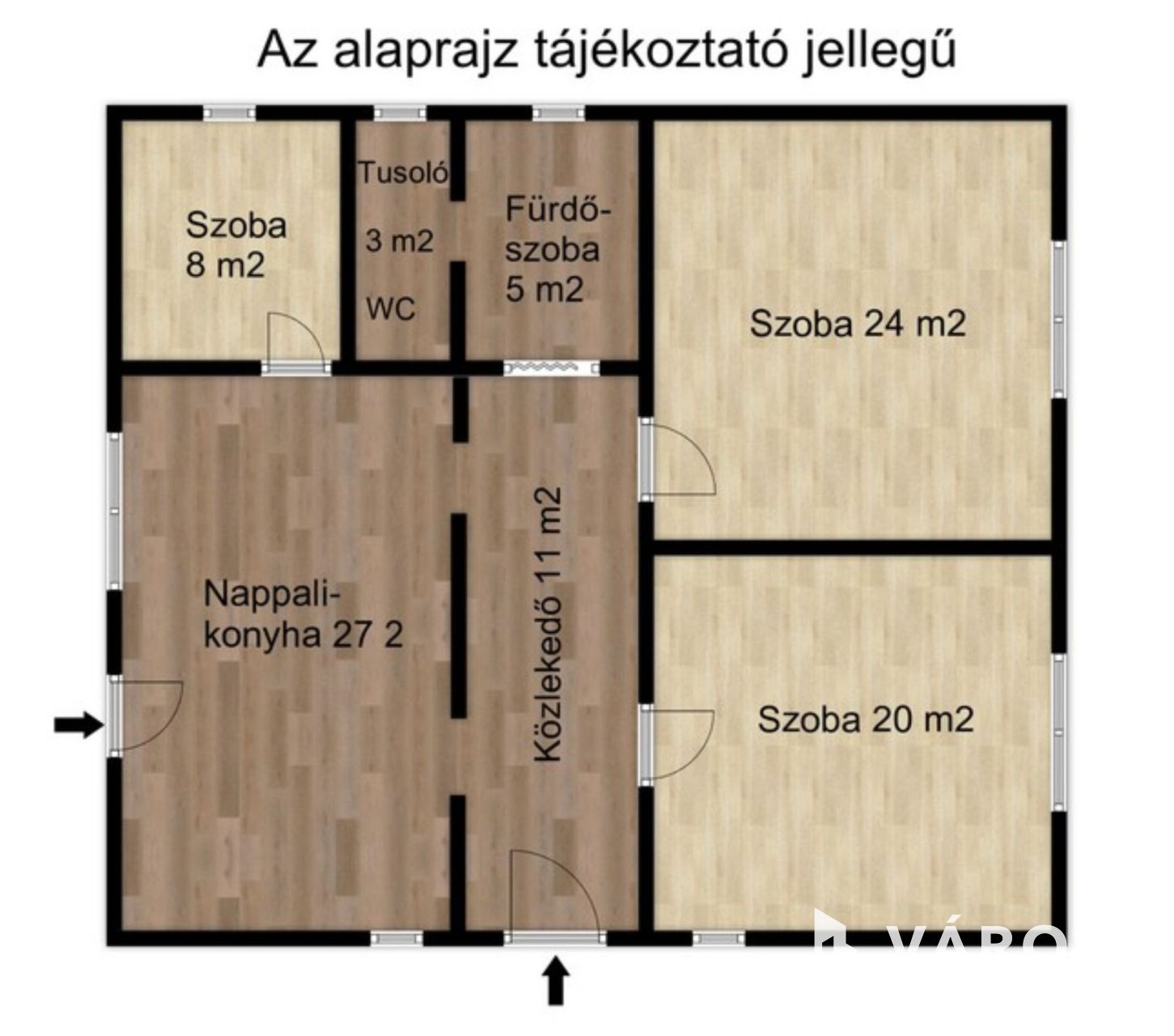 A ház lakótere 100 m2, 2 egész és egy fél szobából, nappali-konyhából, fürdőszoba-WC-ből és a közlekedőből áll. A nappaliból is ki lehet menni közvetlenül az udvarra, ahova a későbbiekben megépíthető egy hátsó terasz.