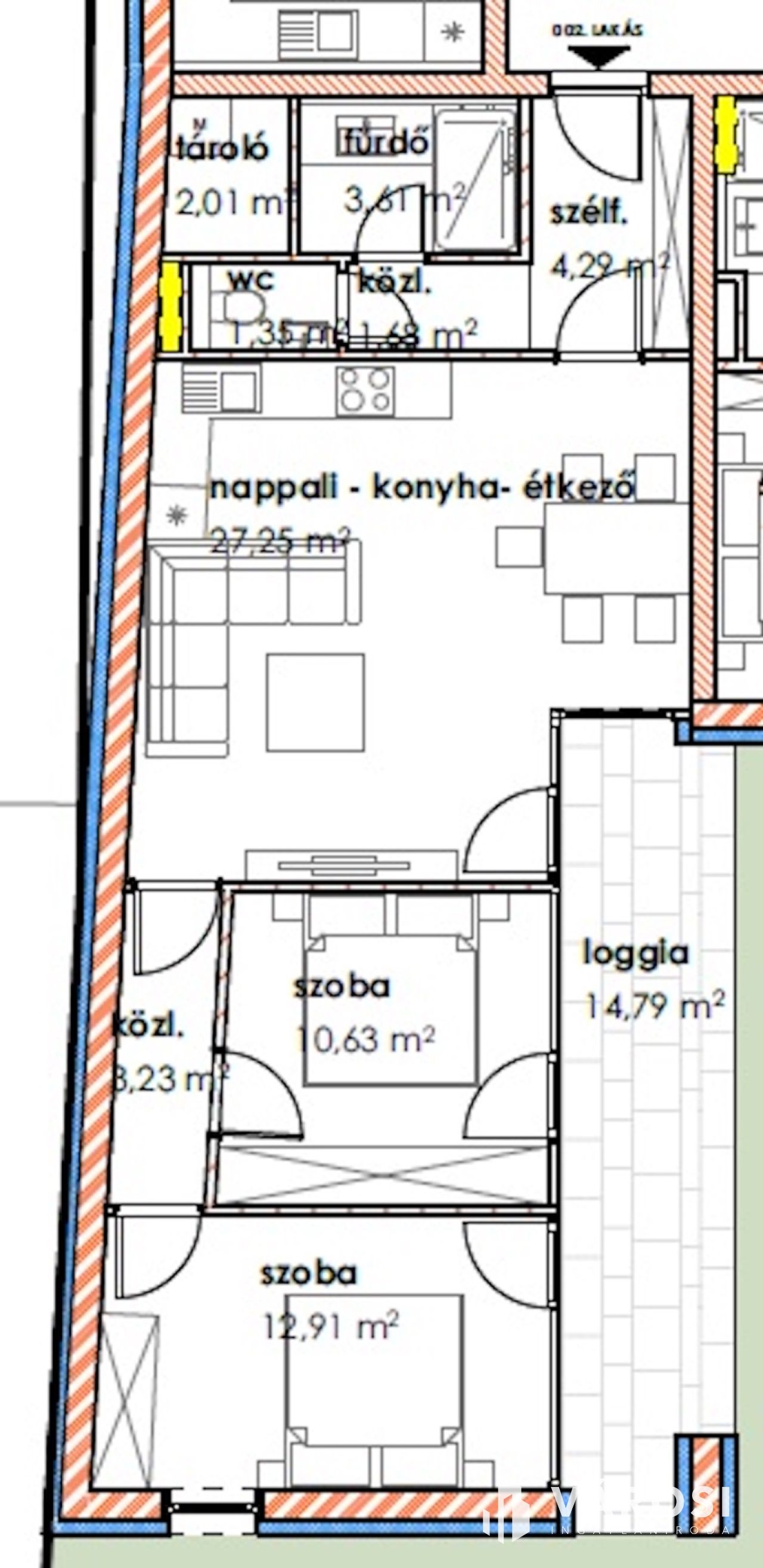 A 1 db amerikai konyhás nappalival, 1db hálószobával, 1 db fürdőszobával, közlekedővel, loggiával rendelkezik.