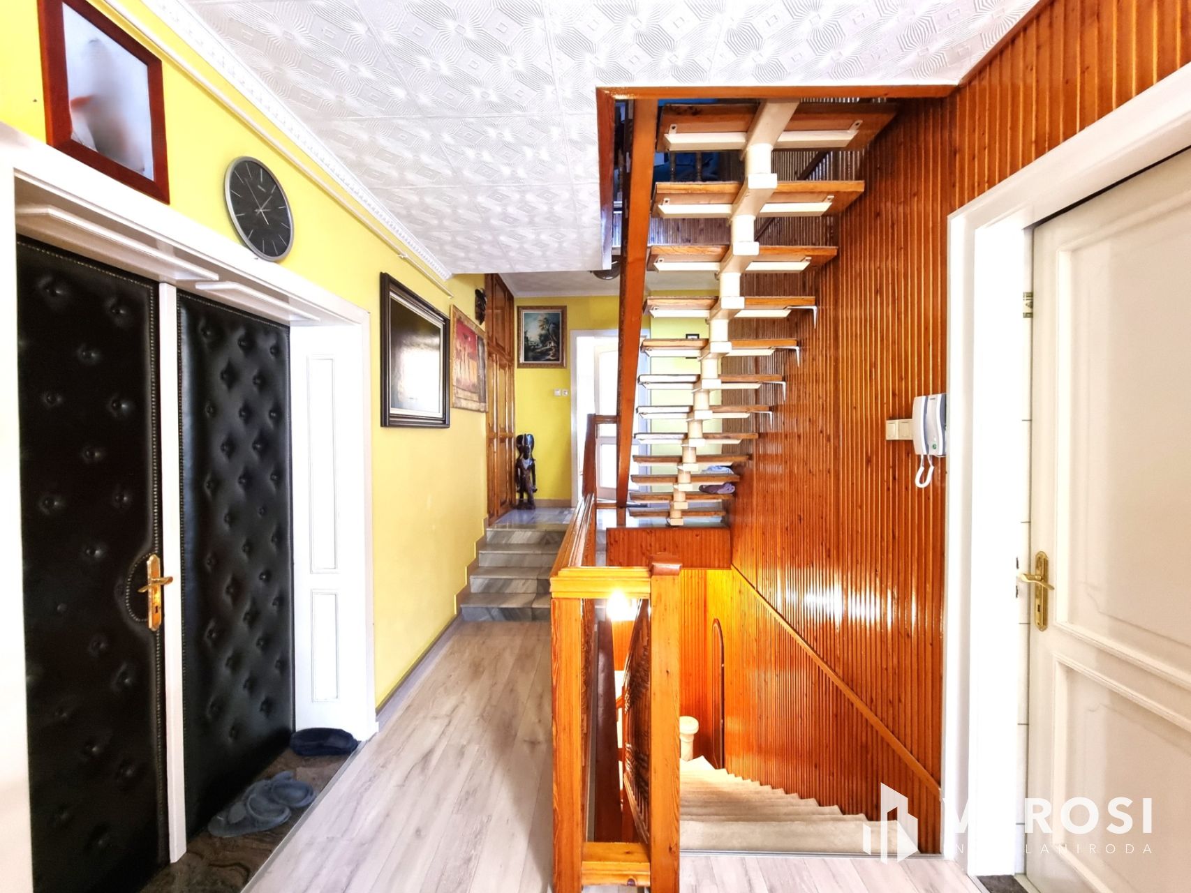 Az emeleti lakótérben, az amerikai konyhába és étkezőbe érkezünk, ahol a modern, egyedi konyhabútor új elektromos berendezéseket rejt magában. Ezen a szinten található három világos, tágas szoba, eredeti, szép állapotú, parkettázott aljzattal. A udvar felőli szobában hangulatos, fa tüzelésű kandallót építettek be. Majd az új burkolatú közlekedőn keresztül eljutunk az igényesen felújított sarokkádas, zuhanyzós fürdőszobába és külön toalettbe.