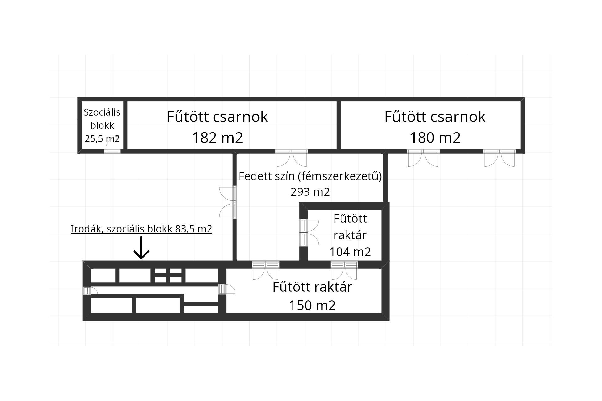 *182 m2 + 180 m2, -- 4,10 m belmagasságú betonpillér szerkezetű, fűtött csarnok és hozzátartozó 25,5 m2 szociális blokk