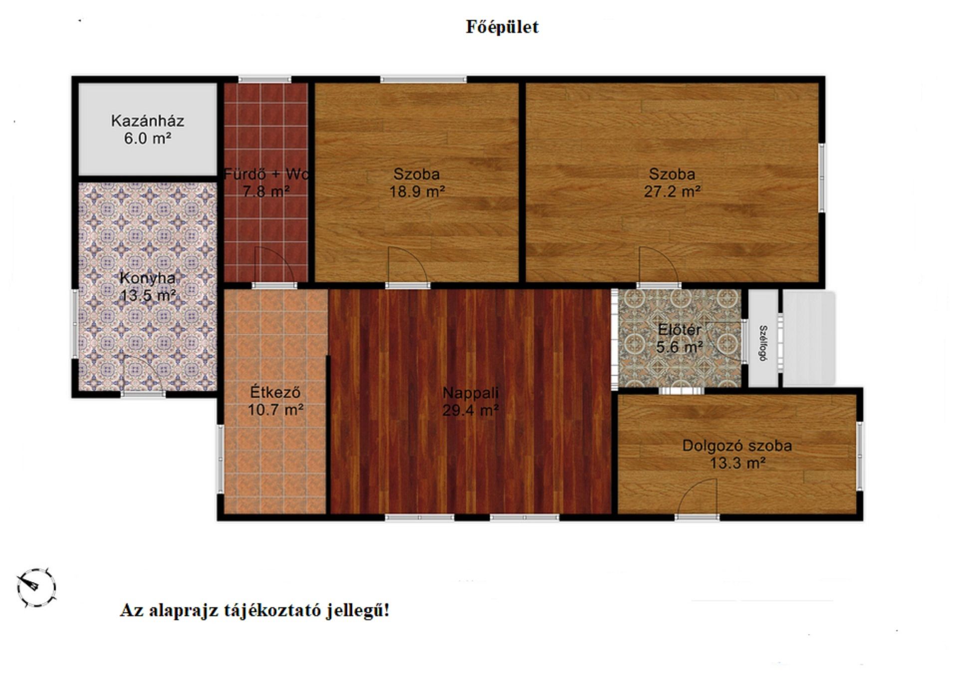 Főépület helyiségei: 2 szoba + nappali, dolgozó szoba, fürdőszoba + wc, konyha, étkező, kazánház.